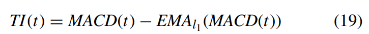 추세 지표(TI, Trend Indicator) 는 MACD 시퀀스의 단기 지연(l1) EMA를 원래의 MACD(t)간의 차로 계산되며 이는 아래와 같이 정의된다. 여기서 l1 < l2 < l3이다(시간의 길이). TI는 여러번의 차분을 포함하기에 CP 주변구간에서의 2차 미분(second derivative) 과 유사한 역할을 한다.