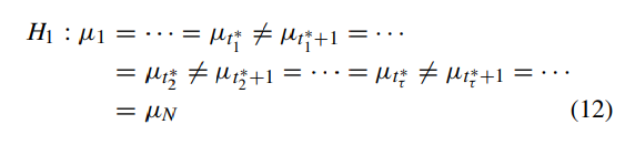 앞서 살펴본 방법은 최대값을 가지는 단 하나의 변화점을 탐지하는 방법론이기에 다중 변화점(multiple cps)를 찾기 위해서는 아래의 대립가설을 풀어야할 것이다.