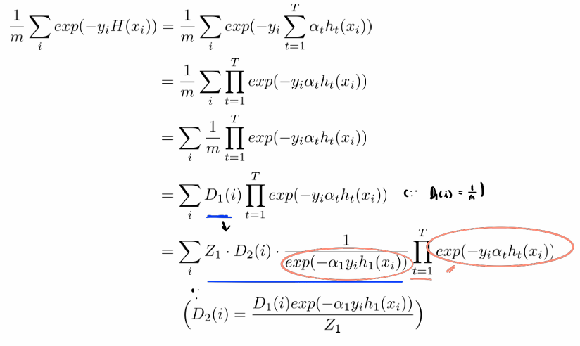 이제 다음을 목표로 증명을 해보자. 이는 cumulative missclasification error의 합이 정규화 상수들의 곱 * 모든 샘플의 비용총합에 의해 결정됨을 보이고자하는 것이다. 즉, Zt 를 최소화하면 최종적으로 학습 오류도 줄일 수 있음을 증명하는 과정.
