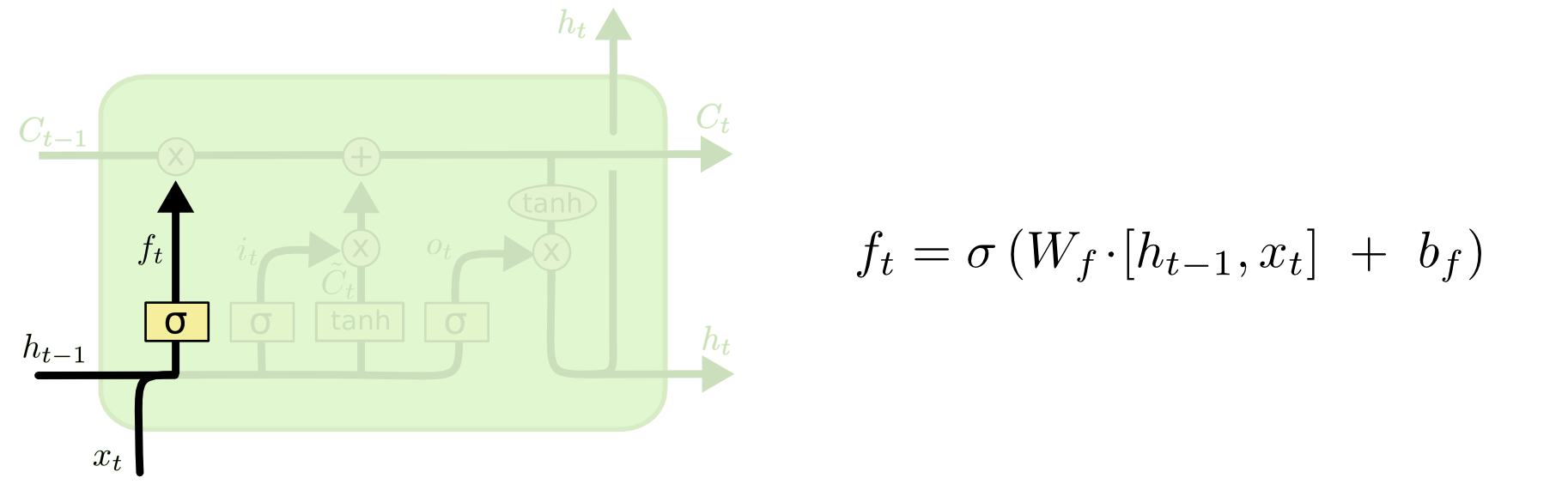 Forget gate는 cell state에서 sigmoid layer를 거쳐 어떤 정보를 버릴 것인지 정합니다.