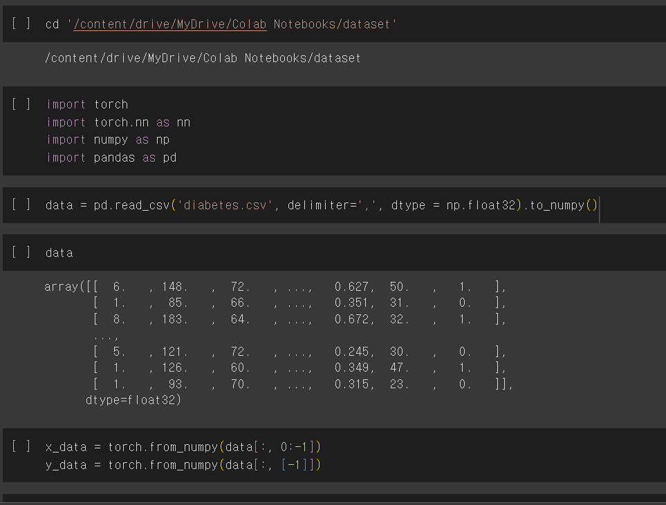 보면 데이터를 pandas를 이용해 읽고, 이후 각 data를 numpy로 변환하였는데 해당 방식보다 효율적인 방식이 파이토치에는 존재한다. Dataset과 DataLoader이다.