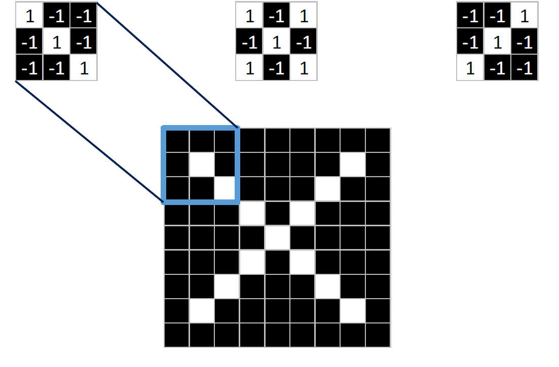 이렇게 구해낸 패턴이 있는 필터를 convolution filter라고 한다.그러면 이후 학습한 패턴과, 주어진 다른 이미지의 부분과의 유사도를 각 pixel 값들과의 곱셈의 합으로 구할 수 있다. 이를 통해 얻어내는 매칭의 정도를 나타내는 결과이미지를 activation map이라고 한다.