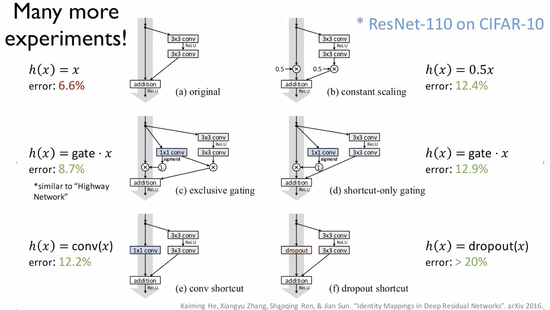 Identity Mappings in Deep Residual Networks(https://arxiv.org/abs/1603.05027)에서는 더 다양한 모델 아키텍쳐에 관한 실험을 진행하였다. 이에 관한 내용은 차후에 기회가 되면 포스팅 해보겠다..!