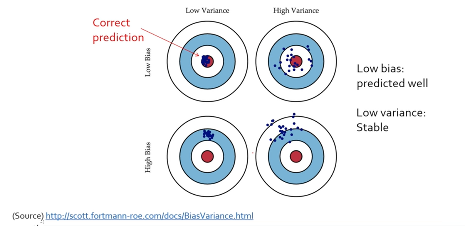 즉, 실제 정답과 얼마나 맞느냐?에 관한 Error term이다. Bias가 높다는 것은 모델 학습이 제대로 되지 않았다는 것을 의미하기에, 모델이 잘못 설계되었을 가능성이 크다. 즉 underfiitng되어있음을 의미한다. 이 경우 data의 양을 늘려주어도 해결되지 않을 가능성이 있다.