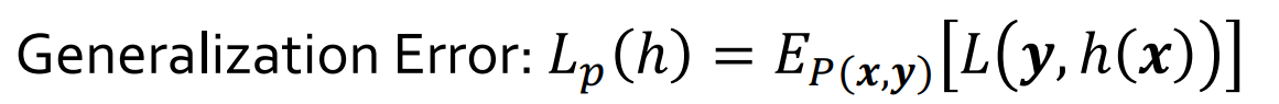 Generalization Error란, 기준이 되는 error로, Universal set(= P(x,y), True Distribution, 모든 data가 존재한다는 가정하에 있는 이상적인(구하는 것이 불가능한) dataset, x와 y에 관해 모든 가능한 상관관계를 표현하고 있는 set)에서의 Loss의 기댓값으로 정의된다.