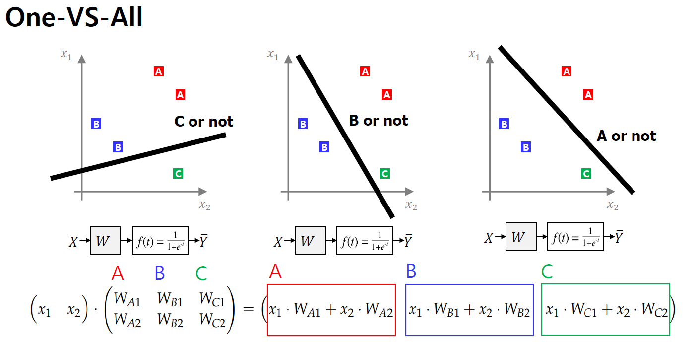 각각의 class에 속하는지 아닌지에 관한 여러 linear classification 모델을 합하여 비교하는 방식인 one-vs-all을 이용해 multi class classification을 사용가능하다.