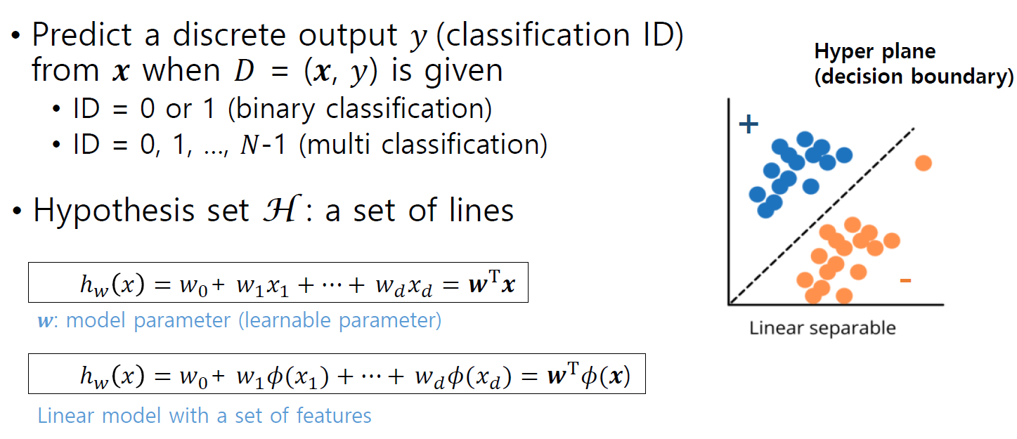 우선 Classification 문제이기에 Discrete한 output을 가지면서 동시에 그 수식은 linear한 수식을 가지는 것이 Linear Classification문제이다.
