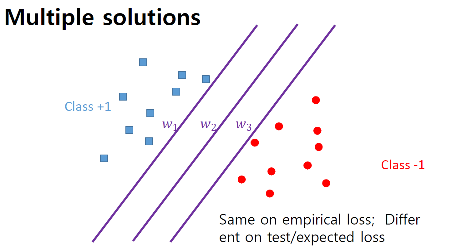 기존의 Linear classification을 보면, 2 Class를 구분하는 hyperplane은 다양하게 나올 수 있다.