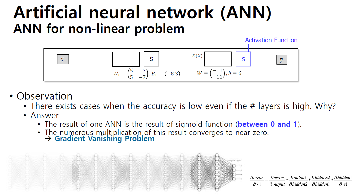 ANN의 경우에는 활성화함수를 비선형으로 사용함으로서 선형으로만 표현되는 식을 비선형으로 표현되게 만들었다.