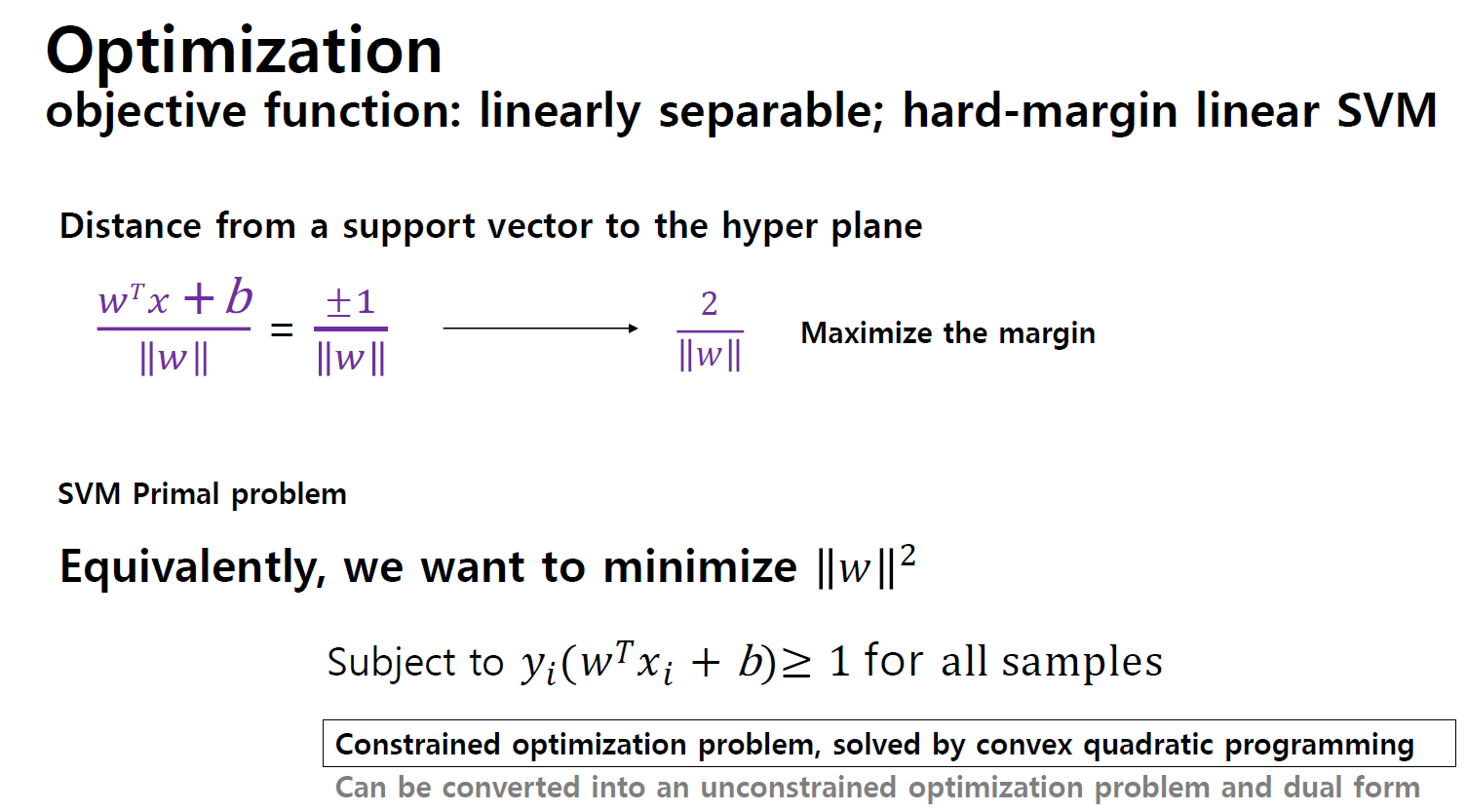이고 제약조건은 위에 나온 것과 같이 모든 데이터에 관해 거리가 양수이거나 0이 되도록 해야한다(y가 음수인 경우에도 음수끼리의 곱이라 양수다)