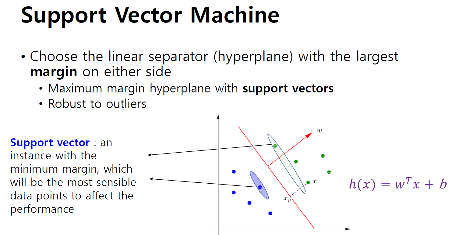 SVM은 Robustness 관점에서 가장 좋은 Hyperplane을 선택하기 위해 Margine과 Support Vector라는 개념을 도입한다.