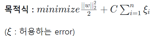 SoftMargin에서는 직선만으로는 분류하기 어려움으로 약간의 Error를 허용하는 정규화식을 추가한다.