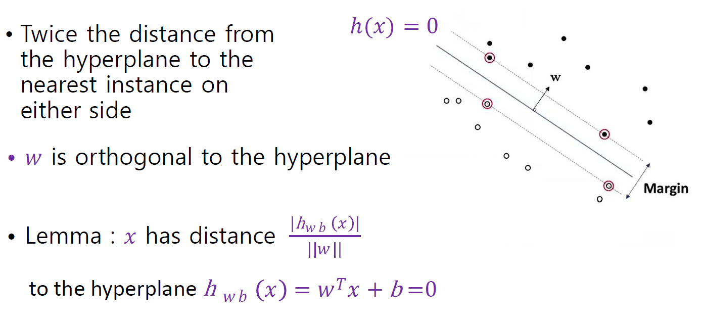 Margin은 hyperplane의 식을 $h(x) = w^Tx + b$라 하자.