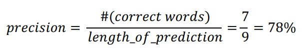 Precision은 모델이 True라고 예측한 것 중 실제 정답의 비율임으로, reference와 같은 단어의 개수(Corrected word)를 predicted한 단어의 개수로 나눈다.