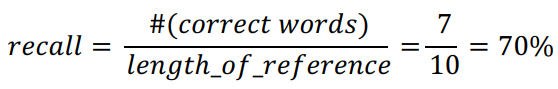 Recall의 경우, 실제 True 중 맞춘 정답의 비율임으로 reference, 주어진 데이터의 단어의 수를 분모로 둔다.
