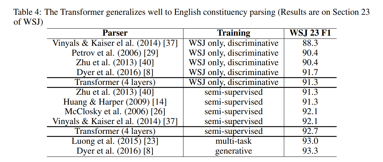 Transformer가 다른 task에서도 잘 동작하는지를 보기 위해서 English Constituency Parsing task에 적용한 결과이다. Constituency Parsing은 특정 단어가 문법적으로 어디에(noun, verb 등) 속하는지 분류하는 task이다.