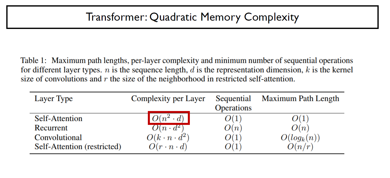 하지만 Memory 관점에서 보면 우리는 n의 제곱 크기의 행렬 계산을 수행해야하기에, sequence의 길이에 따라 메모리 요구량이 기하 급수적으로 필요함을 알 수 있다.