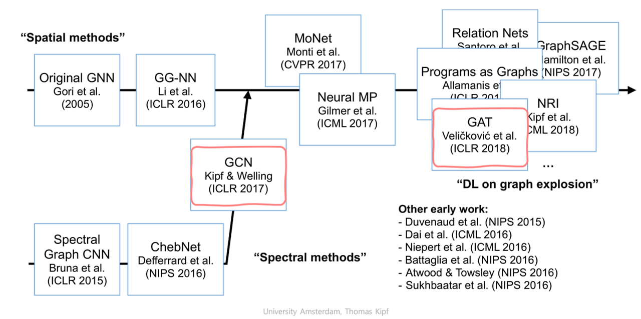 아래 그림은 GNN의 방법론이 어떻게 변화했는지 도식화 한것으로, GCN 이후 Spatial한 방법론으로 paradaim shifting이 일어난것을 확인가능하다.