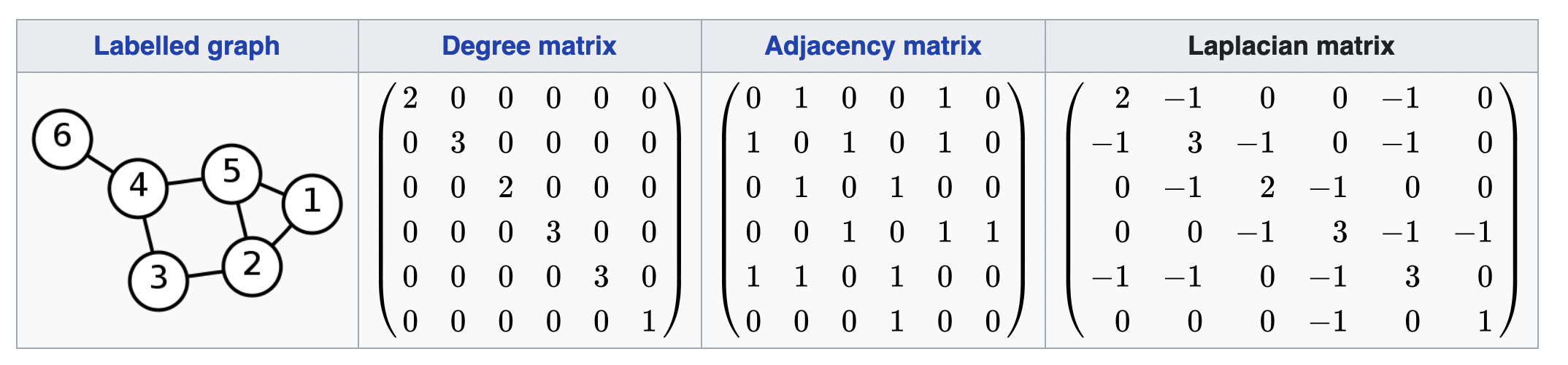 - 그래프의 인접 행렬은 노드들 간의 연결 여부를 나타내는 정방 행렬(square matrix)